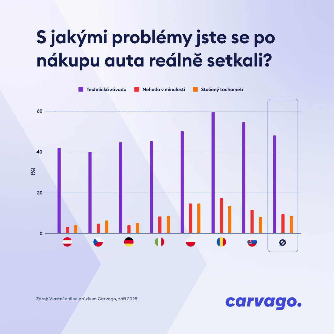 Z průzkumu jednoznačně vyplynulo, že obavy veřejnosti nejsou liché. Respondenti byli totiž dotazováni také na reálné zkušenosti s pořízením vozu z druhé ruky, pokud v posledních letech nakupovali oni sami nebo někdo z jejich nejbližších. A ukázalo se, že nějaký problém muselo řešit 57,4 procent kupujících. Nejčastější byla technická závada vyžadující opravu (v průměru 48 %), přičemž například na Slovensku to bylo dokonce 54,9 %. V téměř čtvrtině případů přitom náklady na opravu přesáhly 1000 eur.