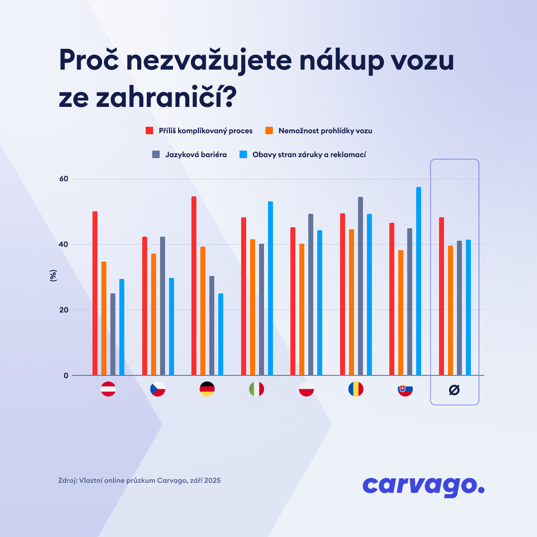 Není divu, že vzhledem k negativním zkušenostem s místními bazary lidé často zvažují pořízení vozu jinou cestou včetně dovozu ze zahraničí. Jako hlavní bariéry však vnímají složitost celého procesu (48,2 %), obavy ze záruky (v Itálii 53,3 %, na Slovensku pak 57,6 %) a jazykovou bariéru (například v Česku 42,5 %). Carvago má přitom službu postavenou tak, aby žádný z těchto problémů zákazník v praxi řešit nemusel.